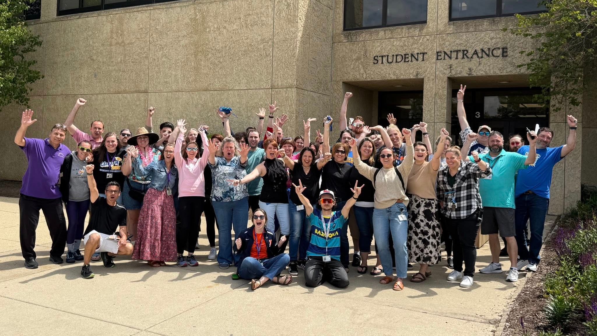 Staff group cheering on last day of school