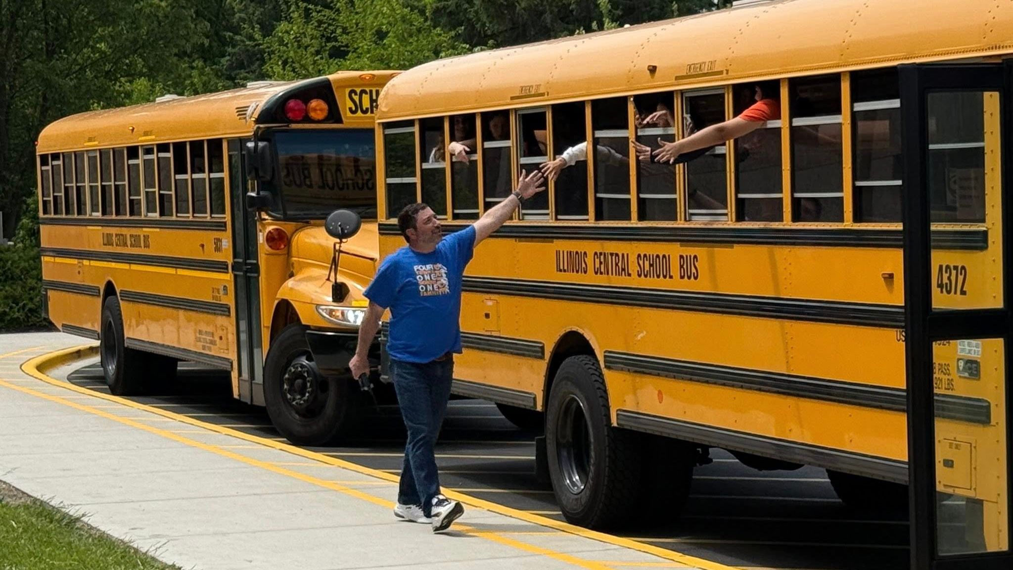 Principal giving high-fives to students on bus