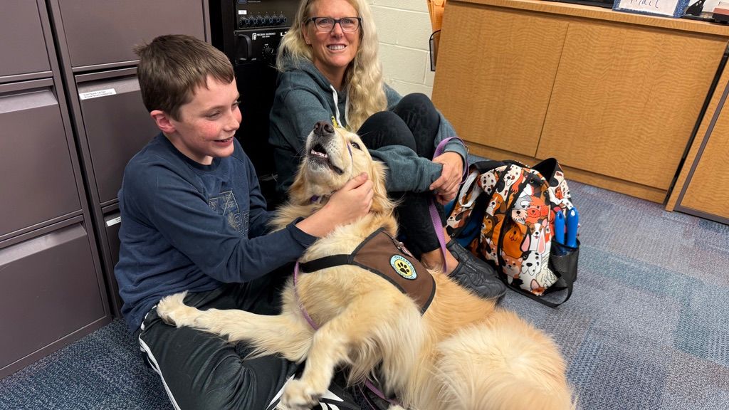 Student petting therapy dog