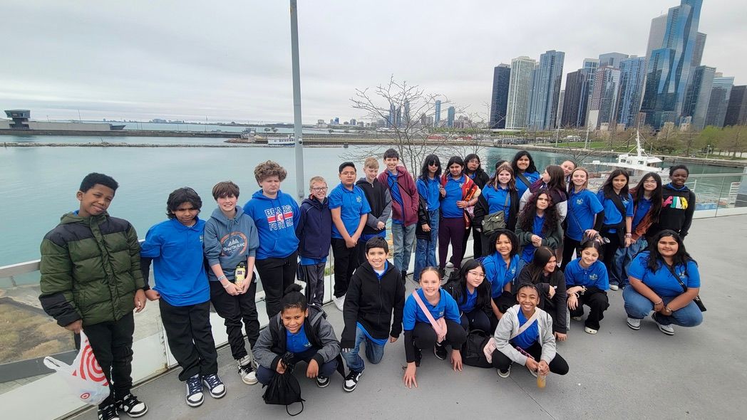 Students fieldtrip group in front of Lake Michigan